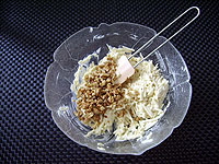 - Baumnüsse in grobe Stücke schneiden und in wenig Butter leicht rösten und auskühlen lassen.