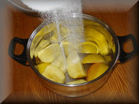 - Äpfel mit Weisswein, Zucker und Zimt in Topf geben.